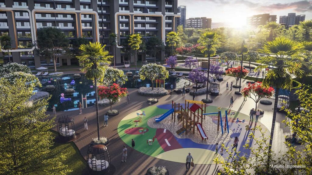 Residents have access to rooftop jogging tracks, a gym available 24/7, a spa, co-working spaces, poolside cabanas, senior clubs, children’s areas, yoga decks, and thoughtfully designed green landscapes throughout the development.